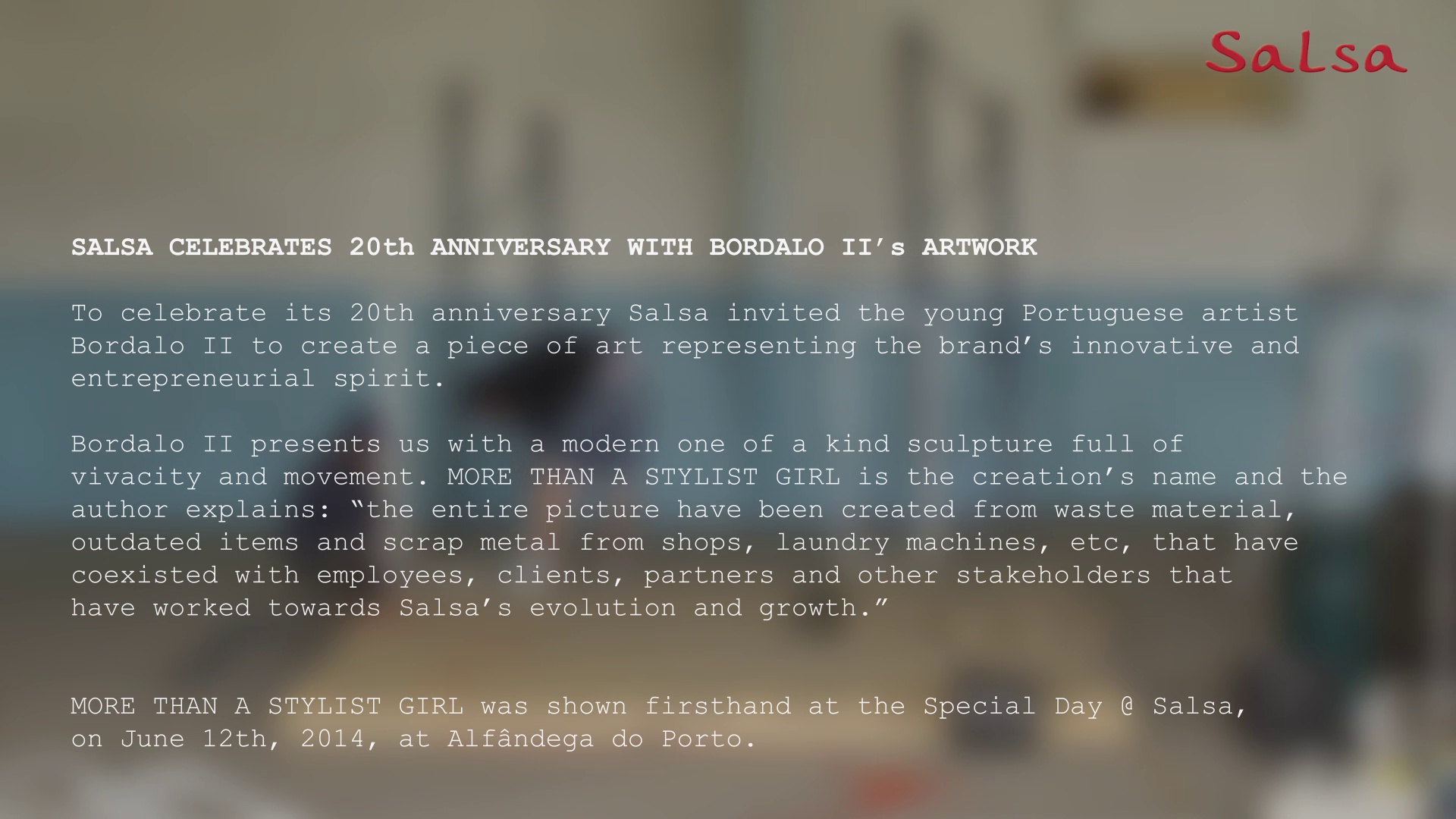 Salsa é uma marca portuguesa especialista em jeanswear, estabelecida em 1994 em Vila Nova de Famalicão. O vídeo, feito em comemoração aos 20 anos da marca, mostra a construção da escultura “MORE THAN A STYLIST GIRL” de Bordalo II.